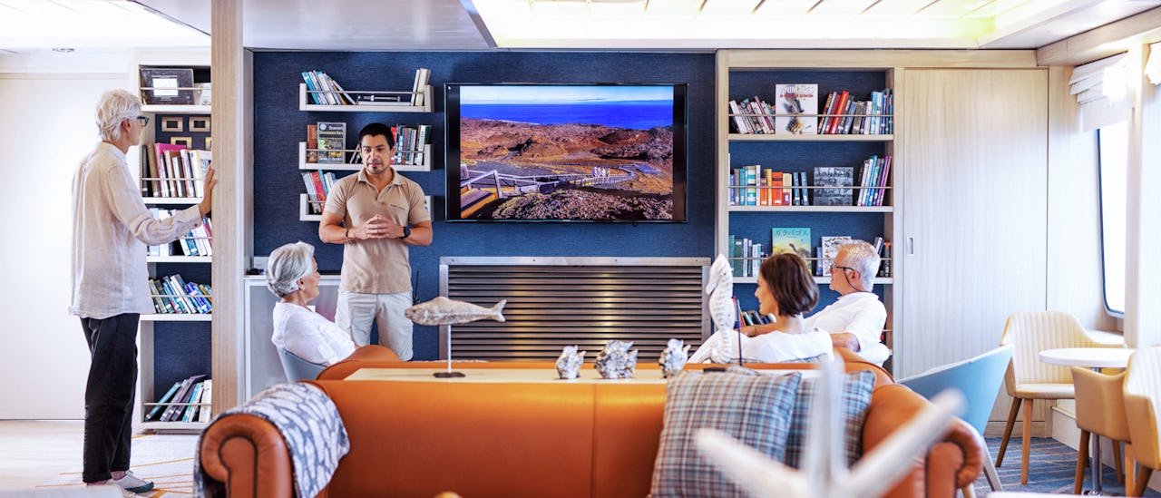 Facing the front of the ship, at the Expedition Veranda is a fantastic place to admire the beauty of the Galápagos’ Islands